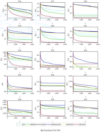 According to the data in Table 2, the percentage of improvement in calculation accuracy between FSGWO and each competing algorithm can be calculated, and the results are shown in Table 4. In Table 4, a negative number means that the calculation accuracy of FSGWO for this test function was not as good as that of the competitive algorithm and the term Average represents the average percentage of improvement in the calculation accuracy of FSGWO over the competitive algorithm for the 30 test functions. Table 4 shows that for the 30 30D test functions, the average calculation accuracy of FSGWO was 46.98%, 54.35%, 64.84%, 69.02%, and 62.27% higher than those of EO, MPSO, GWO, HPSOGWO, and SOGWO, respectively. The calculation accuracy of FSGWO was significantly higher than those of the competitive algorithms.