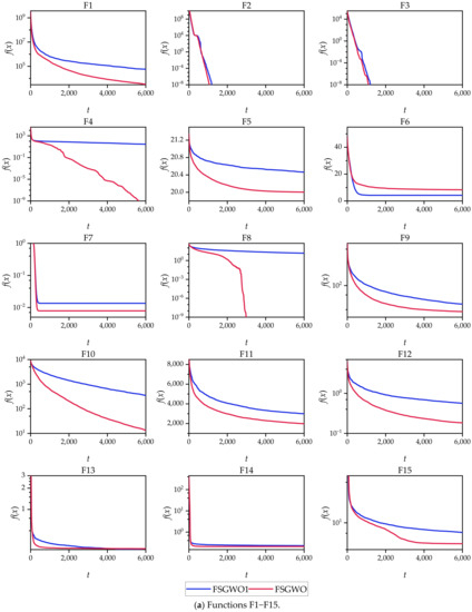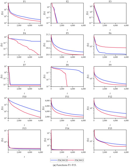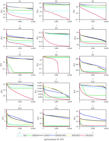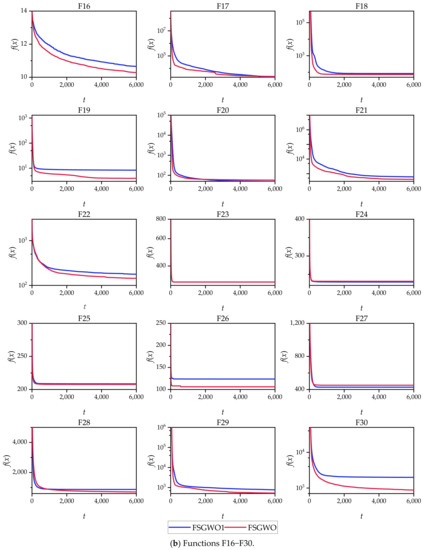The results in Table 2, Table 3, Table 4, Table 5, Table 6, Table 7, Table 8, Table 9, Table 10, Table 11, Table 12, Table 13, Table 14, Table 15, Table 16 and Table 17 and Figure 2 show that the FSGWO algorithm can obtain higher-quality solutions, which indicates that the proposed algorithm has strong optimization ability and stability. These advantages of FSGWO come from the following improvements. (i) The fuzzy direction Dc is added with both global and local search information, which enhances the ability of FSGWO to approximate the optimal solution, thereby producing a high-quality solution. (ii) The new individual Xu generated by the fuzzy crossover operator does not mutate in all dimensions, which effectively controls the divergence of the algorithm and improves the stability and robustness of FSGWO. (iii) The binary joint normal distribution and fuzzy perturbation can adaptively adjust the control parameters and rb of FSGWO, which not only reduces the blindness of the selection of control parameters but also helps improve the local search ability and stability of FSGWO.