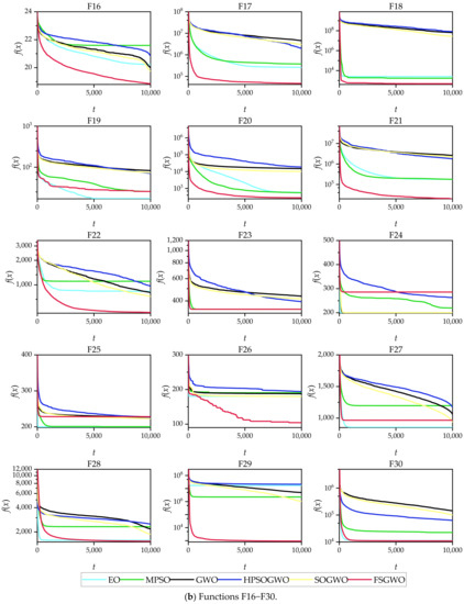 Recent studies have shown that multiple populations have advantages over a single population in maintaining diversity and convergence [67,68]. For our future works, we are interested in some novel topics on GWOs with multiple populations, such as the exchange method of optimal solution information between different populations and the design idea of individual search direction in multiple populations. In addition, state-of-the-art evolutionary algorithms, such as self-adaptive quasi-oppositional stochastic fractal search [69] and combined social engineering particle swarm optimization [70], have many creative update strategies for populations and can be used for reference in the future improvement of FSGWO.