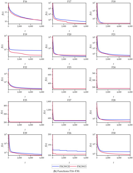 The mean results in Table 2 were analyzed by the Wilcoxon signed-rank test, and the significance level was 0.05. The results of the Wilcoxon test are shown in Table 3. In Table 3, all p values were less than 0.05, which meant that the mean values of FSGWO were significantly different from those of the other algorithms. The results of Table 2 and Table 3 show that the quality of solutions obtained by FSGWO was better than that of the competitive algorithms for the 30 30D test functions.