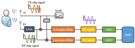 The RX and TX signals are mixed by two orthogonal I/Q channels, then, through low-pass filtering, an intermediate frequency (IF) signal is obtained. The IF signal contains a single tone signal with a constant frequency.