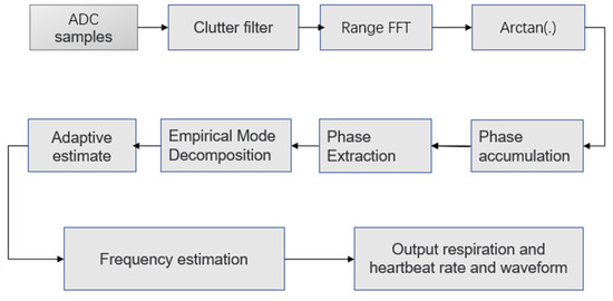 In this paper, an integrated empirical mode decomposition (EEMD) algorithm based on noise distribution features and a static clutter filtering method are proposed. The static clutter filtering method filters the information of static and aperiodic moving objects in the environment. Then, the phase accumulation method is used to enhance the robustness of phase extraction. In addition, the DACM algorithm is used to identify the phase signal of each chirp to solve the phase jump problem. Finally, the improved EEMD eliminates the influence of respiratory harmonics and improves the detection efficiency. This paper is organized as follows: Section 2 explains the principle of FMCW radar vital sign measurement. In Section 3, the implementation steps of the proposed algorithm are introduced. The experimental results and conclusions are given in Section 4 and Section 5, respectively.