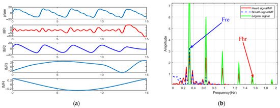 In fact, the respiration rate is about 0.1~0.5 Hz, the heartbeat rate is about 0.8~2 Hz, and the amplitude of respiratory vibration is about 10 times higher than that of heart rate. Therefore, the respiratory harmonic frequency may be close to the heartbeat frequency and have a similar or even higher amplitude [31]. Therefore, traditional methods may misjudge heartbeat signals in the frequency domain. EMD has been proved to have the potential ability to deal with this problem [27,28,29,31]. EMD can avoid the impact of respiratory harmonics on heartbeat signals to a certain extent and separate the correct heartbeat signals.