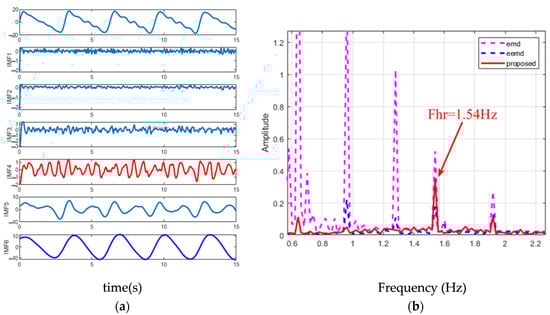 (a) Decomposition results of simulated signals using the improved EEMD, the red line is the component close to the respiratory rate, and the blue line is the component close to the respiratory rate. (b) Spectrum comparison of heartbeat IMF obtained from simulated signals using EMD, EEMD and the improved EEMD. The respiratory rate and heartbeat rate are set as shown in Figure 5, that is, = 0.32 Hz and = 1.54 Hz. The second, third, fourth and sixth breath harmonics were added, and the SNR was set to 0.2.