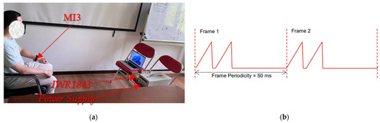 (a) Experimental setup, which included volunteers, FMCW radar (IWR1843) component, and a laptop. (b) Radar chirp parameter setting.