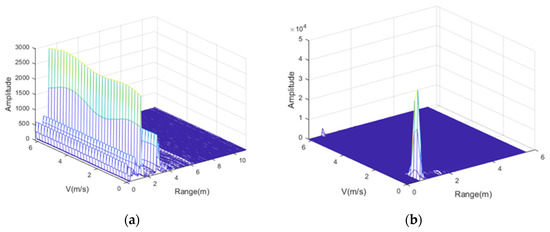 As shown in Figure 9a, before the static clutter filter processing, the radar detects moving targets and stationary objects, and it is difficult for us to distinguish the location of the tested targets. After static clutter filtering, as shown in Figure 9b, we can see that only the tested targets exist in the whole picture, which proves the effectiveness of static clutter filtering. Through this method, we can define the test range. This can avoid the influence of moving target’s displacement at the same distance from the subject to vital signal extraction and improve the accuracy of estimation of heart rate and respiration rate.