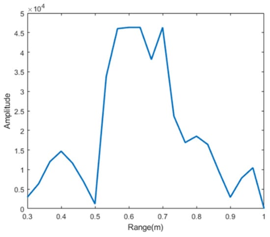 As shown in Figure 10, we can see a significant peak on the spectrum, with the target distance of 0.65 m from the radar, and the peak spread distance of about 25 cm on the spectrum. This is caused by the range resolution of the 77 GHz radar, which is the ability to distinguish two or more objects. When two objects are close enough, the radar system will no longer be able to tell them apart. We know that the radar range resolution for . As shown in Table 3, is 4 GHz, the range resolution is 4 cm. The vibration displacement around the chest caused by breathing and heartbeat is also reflected in the radar echo.