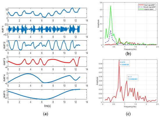 (a) EMD decomposition results of actual signals, the red line is the component close to the respiratory rate. (b) Spectrograms of actual signals, respiratory spectrograms, and (c) heartbeat spectrograms. IMF3 and IMF2 are considered to be the closest respiratory and heartbeat components, respectively. In (c), there are false peaks in the range of 0.8−2.0 Hz in both the original signal and the heartbeat spectrum, making it difficult to estimate the heartbeat frequency.