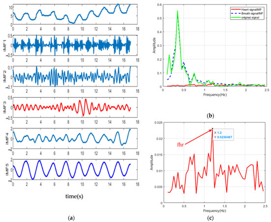 (a) Decomposition results of actual signals using the method proposed in this paper, the red line is the component close to the respiratory rate, and the blue line is the component close to the respiratory rate. (b) spectrograms of actual signals, respiratory spectrograms and (c) heartbeat spectrograms. IMF5 and IMF3 are considered to be the closest respiratory and heartbeat components, respectively. The heart rate of 1.2 Hz can be estimated from the IMF3 spectrum of (c) in the range of 0.8−2.0 Hz.