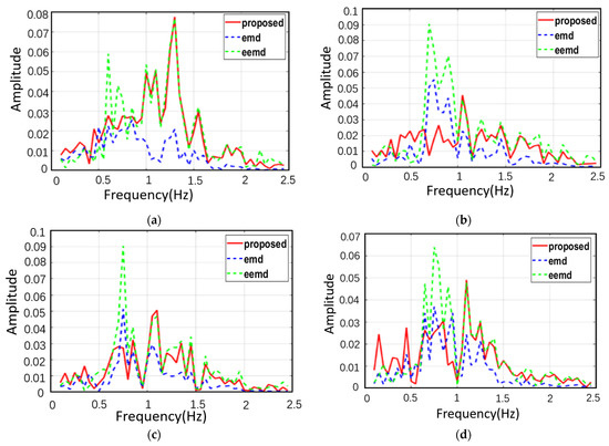 In order to verify the superiority of this method, the spectral comparison of heartbeat IMF is presented in Figure 13. The results of Figure 13a–d are respectively from four randomly selected fragments of actual signals. Heartbeat component characteristics obtained by using the method in this paper are more obvious, and it is easier to determine the heartbeat frequency with this system. Although the results obtained by EEMD are much better than those obtained by EMD, there are still residual errors of respiration and its harmonic components, and the magnitude of residual errors of respiration harmonic components is larger than that of heartbeat components, which is consistent with the simulation results in Figure 6.