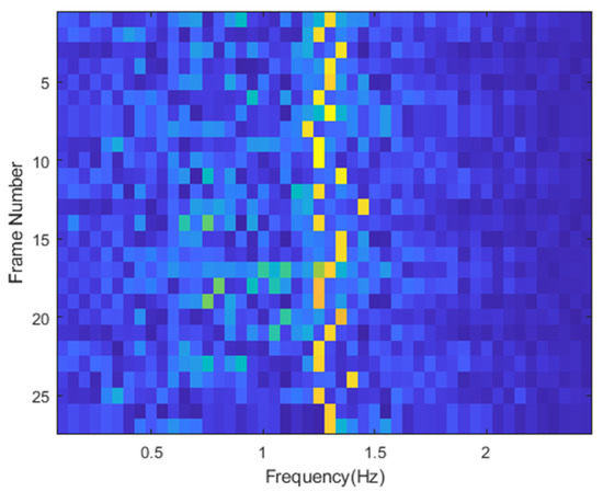 In order to verify the robustness of our proposed method, we conduct a long time flow experiment to verify the spectral estimation performance of our algorithm. During the experiment, the sampling rate was 20 Hz, and the stream data of 5000 frames (250 s) were analyzed with a 200-frame distance window (10 s) and a 20-frame interval time (1 s). The time-varying spectrum of heartbeat IMF is shown in Figure 14. It can be seen that in the whole-time frequency spectrum, heartbeat changes are within the range of 1.2–1.4 Hz (72–84 bpm). The reliability and robustness of the proposed method in long-term measurement are proved.