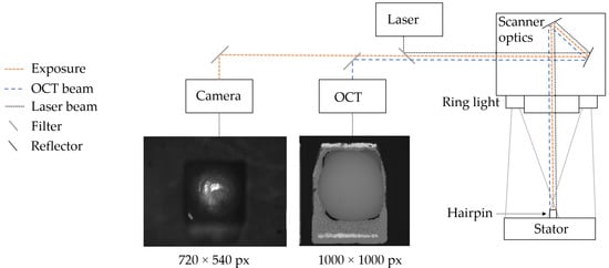 Figure 1 shows the experimental setup for the data acquisition of hairpins. Since the setup had to be integrable into industrial processes, the already-existing hardware arrangement was used. The hairpins were inserted into the stator. A laser welding process connected the two copper wires. The weld quality is influenced by parameters such as material quality, beam deviations, focus position and environmental factors. These process deviations lead to potential welding defects [47]. Using two mirrors, a programmable scanner optic could position the laser beam at any given position within a processing field. In addition, the images were illuminated with a ring light. The advantage was the direct mounting of the LED ring light on the scanner optics, which allowed an easy integration into the production process.