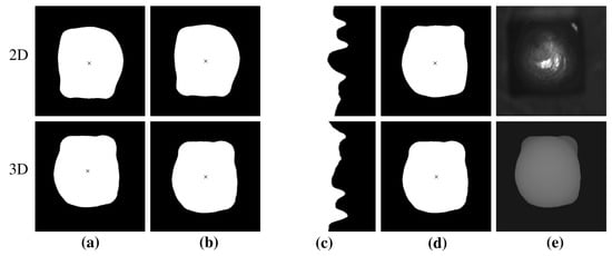 Mapping of the 2D and 3D images of a hairpin. The images of the upper row belong to the 2D image, the lower row to the 3D height profile. The raw data of the considered pin can be seen in Figure 1. (a) Masks of the 2D and 3D images learned with a neural network and their centers. In (b), the centers of both masks are translated at the center of the image. The images are transformed into polar coordinates, which can be seen in (c). In (d), the 2D mask is rotated. (e) Result of the mapping.