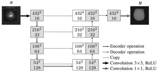 In this work, one architecture of the U-Net and one of the SDU-Net were investigated. Table 4 shows the two configurations to be examined. The dimension of the grayscale images at the input as well as the reconstructions at the output was 432 × 432 pixels. The images were scaled to a range of values of [0, 1]. Configuration I used a classic U-Net architecture. CPDk denotes a convolutional–batch normalization–max pooling–dropout–ReLU layer with k filters. CUDk contained a convolution–batch normalization–upsampling–max pooling–dropout–ReLU layer. Batch normalization is not present in the classic U-Net. The former was added to obtain a faster and more stable network. The encoder architecture was C16–CPD16–C32–CPD32–C64–CPD64–C128–CPD128–C256. The decoder structure was CUD256–C128–CUD128–C64–CUD64–C32–CUD32–C16–C16. The layers were connected with skip connections. All convolutions had the dimension 3 × 3 with a step size of 1. For upsampling, we used a convolution operation that used trainable weights to determine the optimal procedure for the upsampling step. The upsampling factor was 2. The activation function was a ReLU. The output layer used a sigmoid function to scale the output to [0, 1]. Configuration II employed the SDU-Net. It was examined whether a sufficiently good reconstruction could be obtained based on only a few training examples, which is advantageous for industrial applications. PsdCk denotes the encoder operation of the SDU-Net, consisting of a max pooling–sdConvolution–ReLu layer with the filter numbers k. The architecture of the encoder was PsdC16–PsdC32–PsdC64–PsdC128. In the first layer, the max pooling operation was omitted. UsdCk contained the decoder operation of the SDU-Net, consisting of a upsampling–sdConvolution–ReLU layer. The architecture of the decoder was Usd128–UsdC64–UsdC32–UsdC16–C1. Three skip connections between encoder and decoder were used. All convolutions had the dimension 3 × 3. An sdC-block consisted of one standard convolution and four dilated convolutions, with the filter numbers , , , and , respectively. For the stacked dilated convolutions, dilation rates of 3, 6, 9 and 12 were used. The step size was 1. The last convolution layer reduced the number of channels to 1. Here, the activation was a sigmoid function. The architecture of the U-Net configuration is illustrated in Figure 3. The feature maps shown as boxes consisted of the sdC-block instead of the two consecutive convolutional layers in the SDU-Net.