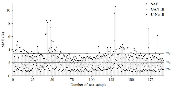 MAE of the 191 test samples. The MAE of three methods over the test samples is shown. is the mean MAE of the SAE, that of the WGAN with L2 norm and that of the SDU-Net (Table 5).