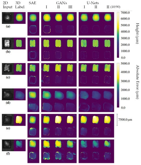 Table 5 shows the test results of the examined 3D reconstruction algorithms. It can be seen that the GANs outperform the SAE. Accordingly, the WGANs show better results than the CGAN. The U-Net-based 3D reconstruction approaches proposed in this paper outperform the other two methods by a large margin. The SDU-Net shows the best performance. Figure 4 presents the MAE of the individual test samples of the SDU-Net, the best performing GAN, namely, the WGAN with L2 norm, and the SAE. The MAE of the respective method is shown as a horizontal line. On closer inspection, it can be seen that there are very few test samples where the WGAN performs better than the SDU-Net. The proportion is only 2.618%. In Figure 5, the 3D reconstruction results from six hairpins of the test data set are given. The 2D input images, the 3D ground truth images as well as the results of the six neural networks are shown. The reconstruction of the SAE suggests the shape of the hairpin. Deviations on the pin surface are visible. There are no sharp edges but smooth transitions into the background. Characteristic features such as the offset of the pin from (e) are not learned. The CGAN shows high differences at the edges of the pins. It produces realistic-looking reconstructions. However, they partly deviate from the ground truth label. Looking at the difference images, it can be seen that the U-Net-based algorithms achieve the best results. Among them, the U-Net II stands out, for example, because the offset of the pin from (e) is reconstructed.