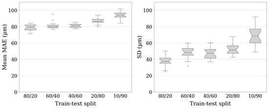 Distribution of the mean MAE and SD of the 3D reconstruction algorithm for different train–test splits. Validation of the U-Net II performance under different proportions of data in the training and testing part for 20 random splits each.