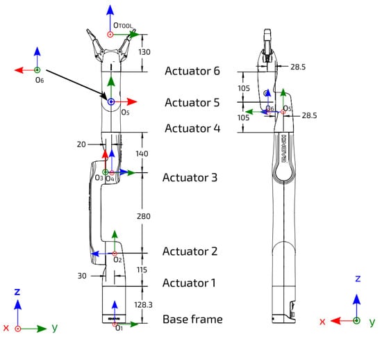 where is the identity matrix. The first step toward solving the IKP of the Gen3 lite is to reduce the number of unknowns, currently six for the six joint positions , to one, reducing the problem to a univariate polynomial equation that can be solved. By finding expressions for and and substituting them in , we can readily reduce the number of unknowns. First, we need to compute , connecting the origin of frame 1 to the origin of frame 6, which can be written similarly to the left-hand part of Equation (2) as