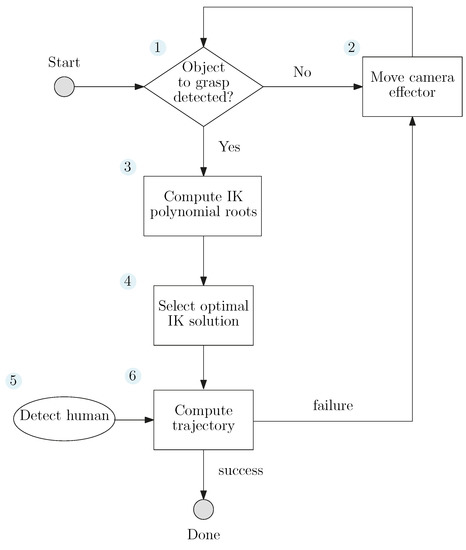 The flow chart detailing the procedure is shown in Figure 2. In block 1, we detect the object to grasp as detailed in Section 6. If it fails, we move the camera (block 2) hook as a robotic manipulator end-effector to another pose (Section 6). If the camera is able to detect the target, its pose is used to compute the IK polynomial roots (block 3). We leveraged a methodology first introduced by Gosselin and Liu [10] to obtain a univariate polynomial equation for the IKP (Section 3 and Section 4), giving us all possible postures (joint space) of the robot for the same end-effector pose (Cartesian space). Section 8.1 presents a validation of the IKP solution with examples and compares it with the solutions obtained with a numerical IKP solver. In block 4, we select the best solution to avoid the occlusion between the actuated camera and all known objects in the workspace (Section 5). Among these obstacles, the operator is tracked by the camera (block 5, Section 6). Finally, a path-planner is used to compute the trajectory between the original and final (optimal) posture, taking into account the occlusion and obstacles (block 6, Section 7). If the planning fails, we change the camera point-of-view (block 2), and start the previous steps again. The proposed methodology was validated in a simulation and with experiments (Section 9). The Python script used to solve the IKP, compute all real solutions (postures), and select the optimal posture is available online [11].