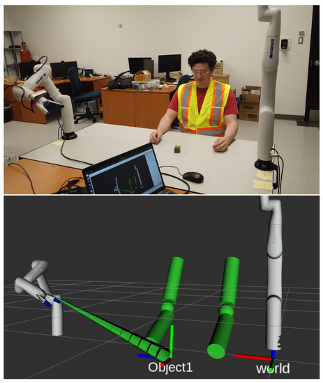 View of the experimental setup: at the top—a photo of the manipulators, camera, operator arms, and the target object; at the bottom—the visualization (in Rviz) of the same scene, with the virtual obstacles in green.