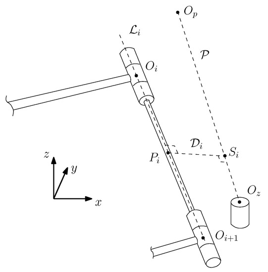 where is a factor defining where along the line this point is located. Moreover, the Cartesian coordinates of points , and are, respectively, arrayed in vectors , and . Similarly, the position of a point along the line can be defined for any given link of the manipulator, i.e.,