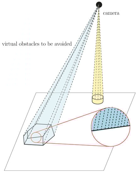 The procedure above is valid if the object is relatively small, i.e., with external dimensions smaller than the threshold chosen. If it is not the case, the proposed technique can still be adapted. Indeed, the line of sight between each object in the workspace and the top-view camera is instead modeled as an irregular pyramid. Therefore, instead of having only one line for each object, the periphery of the latter, as seen by the camera, is discretized (with a step size smaller than ), as depicted in Figure 5. Therefore, the distance between each link of the robot and each line defining each pyramid must be computed for each feasible final posture. In this way, the equations detailed above can be used without any modification.