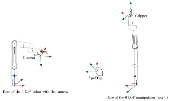 The top-view camera configuration mentioned in the previous section is a common choice for assembly tasks without an operator. However, they are prone to occlusion by the operator’s head and torso whenever he/she bends over the table. Ultimately, no fixed camera position can provide a guarantee of keeping a line of sight on the target. To easily control the pose of the camera in the 3D space, we rigidly attached it to another identical robot. Thus, we have two Kinova Gen3 lite manipulators. As can be seen in Figure 3 (top), an Intel Realsense D455 camera is mounted on the second manipulator’s end-effector, visible on the left-hand side of the figure. Any other robotic arms equipped with a wrist camera can be used for this purpose (for instance the Gen3 and the RobotiQ wrist sensors). We then compute the geometrical transformation from the camera to the right end-effector frame (worker robot) using its forward kinematics (described in Section 4). Frames are illustrated in Figure 6.