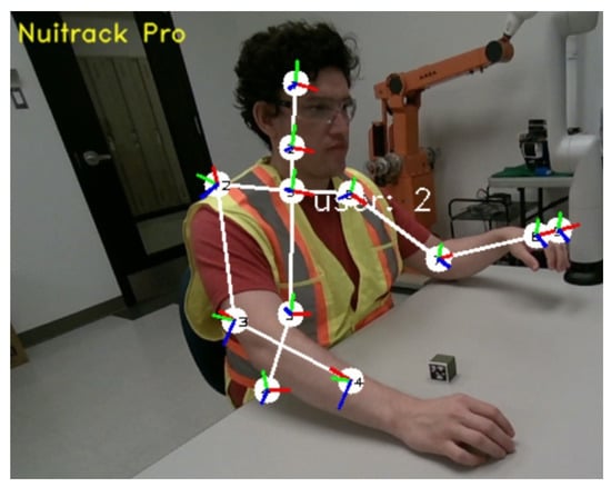 As for detecting the operator—we leverage the Nuitrack software [44] fed with the same camera (D455, RGB, and depth). Nuitrack’s AI skeleton tracking feature provides full body skeleton tracking based on RGB-D data, as illustrated in Figure 7. Using Nuitrack’s SDK, we extract the Cartesian coordinates of the operator’s shoulders and elbows and broadcast them as ROS topics. Since the arms are considered obstacles, another node catches the topic and generates cylinders in the virtual workspace that can be visualized in Rviz, as shown in Figure 3 (bottom).