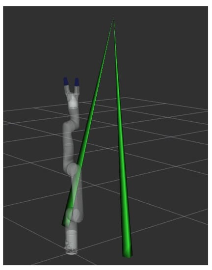 After the initial stage, described in Section 5, where the set of feasible solutions to the IKP is reduced to only the postures respecting the occlusion avoidance criterion, the next step is to plan the trajectory, and, most importantly, to select the shortest path. This can be done with any trajectory planner, such as the ones available in the OMPL, integrated into ROS MoveIt!. Similar to the section above, the line of sight between each object in the workspace and the variable-pose camera is modeled as an irregular pyramid as shown in Figure 8. The apex of the latter is found at the location of the camera. These pyramids are included in the environment as virtual obstacles to be taken into account by the trajectory planner, which is fed with the postures where the shortest distance with the virtual obstacles is above the defined occlusion threshold to select the one with the shortest path.