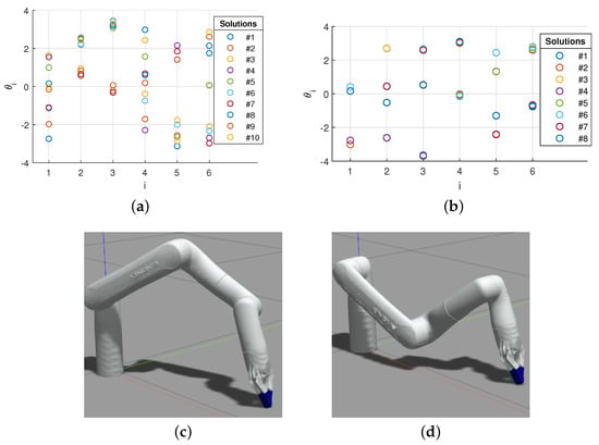 First, it is possible that coefficient V in Equation (15a) becomes equal to zero. Since, according to the procedure detailed in the previous section, both and are required, the value of cannot be computed with atan2. Instead, arccos must be used, and two values of for a single will be obtained. Of course, since the total number of solutions cannot exceed 16, some will be repeated. Another possible special case arises when is equal to zero. Thereby, Equations (13a) and (13b) cannot be computed. Instead, Equations (8) and (12) are solved for with the Weierstrass substitution previously mentioned, leading to two solutions for for a single . As always, no more than 16 unique sets of joint angles can be obtained, which means there will be some repeated solutions again.