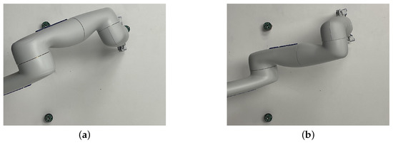 With the postures presented in Table 6, solution no. 8, depicted in Figure 9b, is one of the potential final postures identified by the algorithm as respecting the criterion, i.e., the shortest distance is above the threshold defined with two small objects that must remain visible to the camera above the workspace (with m, m, and m). In this case, considering a threshold of cm, which is larger than the objects’ diameter of 3 cm, only one line for each is considered for the line of sight. The smallest distance between the robot and any of the two is, in this example, 0.0972 m. Moreover, this test was validated experimentally, as shown in Figure 10. The photos are taken from the camera located at , showing clearly that solution no. 8 is significantly better than solution no. 6 with respect to the occlusion risks for objects located at (top) and (bottom). Solution no. 7 is the only other feasible posture with the shortest distance above the threshold of m.