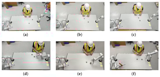 View of the positions of objects, operator, camera, and initial posture of the grasping manipulator for each of the six experimental scenarios; (a–f) show scenarios 1 to 6, respectively.