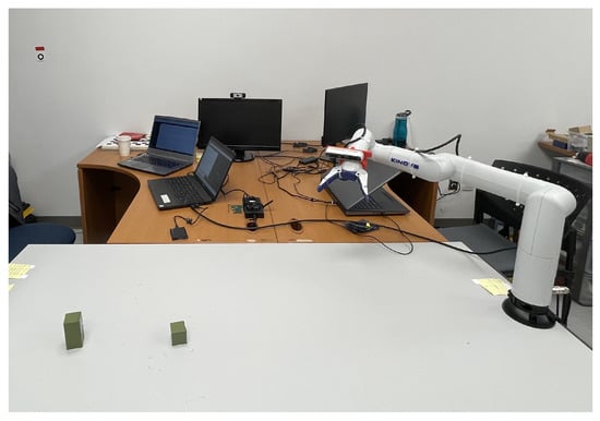 To test and compare the performance of our proposal, six other test cases, illustrated in Figure 11 were executed. For each test case, the two cubes were positioned in different locations within the workspace and the operator position changed slightly. A sample of the test configuration is illustrated in Figure 12. As it was done in the previous scenario, virtual obstacles representing the line of sight between the camera and the objects are included, with the addition of the operator’s tracked arms. Again, the shortest path between the solutions above the occlusion threshold is chosen.