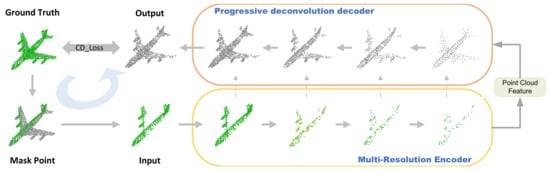 Figure 1, this approach consists of a continuous network of encoders–decoders: a multi-resolution encoder and a progressive deconvolution decoder. In the first network framework, the complete point cloud is used to generate an “approximate” missing point cloud by the multi-view missing point cloud generation method and to form a point cloud pair with the complete point cloud as the basis for training, as shown in the mask points in
