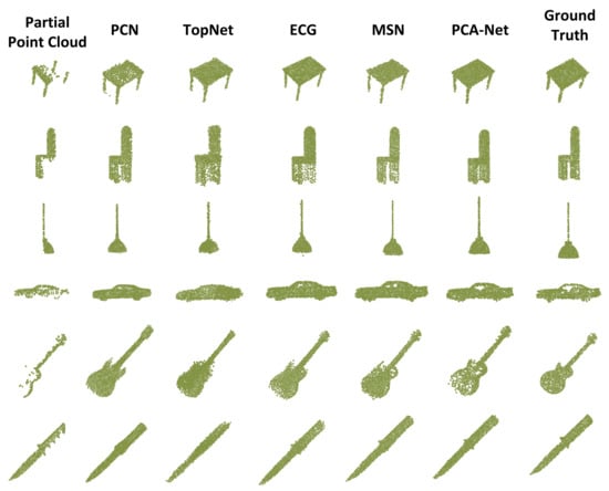 Section 4) normalized to [−1, 1] and then forming point cloud pairs with the complete point clouds. The experimental process is trained in the same way as the 3D benchmark for the point cloud completion. PCA-Net and other methods are given in the following