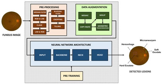 The contributions of this work concerning the state-of-the-art can be summarized as follows: (i) presentation of a convolutional neural network structure based on YOLO version 4 and 5 architectures to improve fundus lesions detection and performing real-time inferences on low-cost GPUs; (ii) implementation of a pre-processing block to reduce outliers and improve enhancement, to provide a more efficient extraction of features from retinal lesions; and, (iii) method for partial cropping of the black background of the fundus images in order to minimize the generation of false positives pixels and the creation of blocks (tiles) to increasing the receptive field of the input images and minimizing the loss of information caused by the reduction of the images used at the entrance of the network, especially in the case of small lesions, such as in the case of microaneurysms.