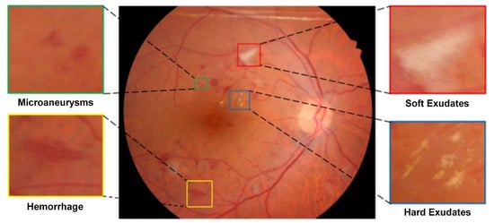 Depending on the presence of clinical features, researchers classify DR as Mild Non-Proliferative Diabetic Retinopathy (NPDR); moderate NPDR; severe NPDR; Proliferative Diabetic Retinopathy (PDR); and Diabetic Macular Edema (DME) [,,,]. DR is usually identified through ophthalmologic examinations that aim to identify retinal lesions, including hard exudate (EX), soft exudate (SE), microaneurysms (MA), and hemorrhages (HE). Microaneurysms are small lesions in the form of small circular red dots that appear on the retina, in saccular shape, caused by a leak from vascular weakness at a certain point and represent the first signs of DR [,]. According to the International Council of Ophthalmology [], microaneurysms are red, isolated spherical dots of varying sizes, which may reflect an abortive attempt to form a new vessel or maybe a weakness of the capillary vessel wall due to loss of normal structural integrity. On the other hand, hemorrhages can occur in the pre-retinal layer, retina, or vitreous and may have a different appearance depending on where they occur []. Hard exudates are lipoproteins and other proteins that leak through abnormal retinal vessels [], being irregularly shaped yellow lesions [], and may also have a whitish-yellow color, with a shiny appearance and well-defined margins [], appearing in different dispositions: isolated, in clusters, in confluent trails or a partial or complete ring []. Soft exudates are retinal microinfarcts resulting from diabetes, hypertension, retinal vein occlusion, papilledema, collagen diseases, anemia, and leukemia [], having the form of spots and having a pale appearance, usually in greyish-white tones, and with blurred and irregular edges.