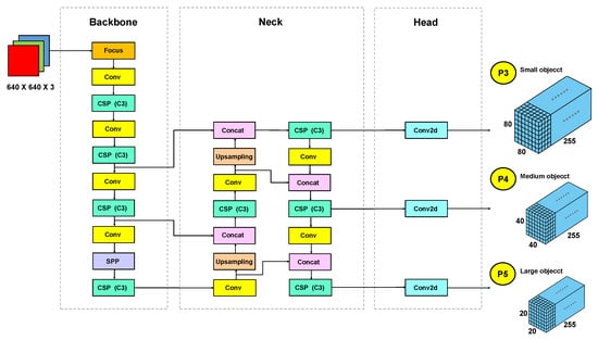 The network Backbone was used as a pre-trained feature extractor on an image classification dataset, useful for detecting objects in the last layers of the network. The Backbone used in the experiments is composed of a CSP-Darknet-53. The convolutional neural network Darknet-53 was initially used as Backbone of the YOLOv3 [] model, replacing its predecessor Darknet-19 [], as it includes the use of residual connections as well as more layers since it has 53 depth layers []. Furthermore, its architecture is built by consecutive layers of convolution and followed by a jump connection, which helps activations propagate through deeper layers without gradient dissipation.