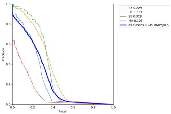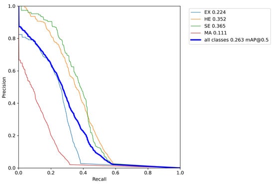 Another way to evaluate models that perform object detection is through , a metric widely used to evaluate deep learning models [,,,]. Its main feature is the ability to compare different models, contrasting precision with recall. The definition of the metric for object detection was first formalized in the PASCAL VOC challenge. To calculate , just average the Average Precision calculated for all object classes [], as shown in Equation (4). Although it is not simple to quantify and interpret the results of a model, is a metric that helps evaluate deep learning models that perform object detection.