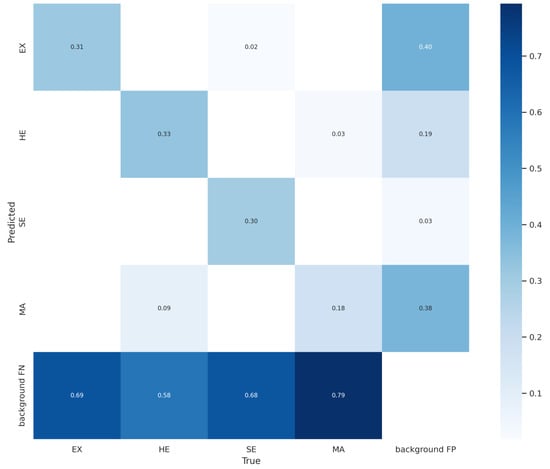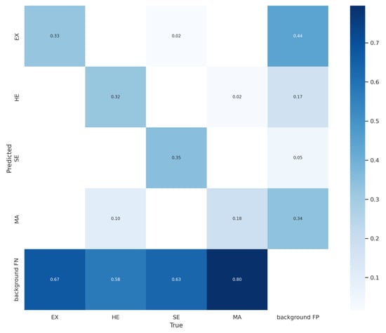 The YOLOv5 s was used because it achieved the best results in detecting fundus lesions and at a lower computational cost compared to other versions. The explanation for the shorter version of YOLOv5 to have obtained the best results lies in the fact that the fundus microlesions present a gradient dissipation problem when training the versions of YOLOv5 with greater depth and number of parameters. Thus, using a model with a smaller number of parameters allowed us to use fewer hardware resources, thus enabling the detection of fundus lesions through low-cost GPUs without impacting the precision of the proposed approach. The deep neural network structure used in our approach has a total of 283 layers, million parameters, and GFLOPs. According to Yu et al. [], GFLOPs represent the 1 billion worth of FLOPs (floating-point math operations). Another advantage of using the YOLOv5 model as the basis of this approach is the possibility of integration and portability with different types of projects, including mobile devices. This feature is associated with the fact that this model has been implemented natively in PyTorch.