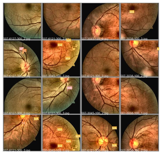 Li et al. [] presented a new Diabetic Retinopathy dataset titled Dataset for Diabetic Retinopathy (DDR) and evaluated state-of-the-art deep learning models for classification, segmentation, and detection of lesions associated with Diabetic Retinopathy. To evaluate these methods in clinical situations, 13,673 fundus images were collected from 9598 patients. These images were divided into six classes and evaluated by seven specialists to identify the stage of Diabetic Retinopathy. In addition, the authors selected 757 images with Diabetic Retinopathy to annotate the fundus lesions: Microaneurysms, Hemorrhages, Hard Exudates, and Soft Exudates.