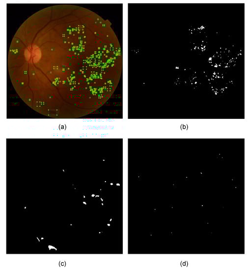 Due to these limitations, the severity of DR, and also the impact of this disease on health and quality of life over the people, it is opportune to propose the creation or optimization of procedures, approaches, and computational tools capable of providing fast and accurate support for medical diagnosis, with minimal human intervention. In the literature, approaches based on deep learning have been presented to classify, segment, and detect retinal lesions associated with DR. These works aim to assist in diagnosing DR through deep neural networks, such as [,,,,]. However, although these works have achieved promising results, detecting retinal lesions has presented limited results. The limitations are due to the complexities of retinal fundus images (low contrast, irregular lighting, blurred lesion boundaries, shape, and size) and the few examples of the lesions, which cause problems in feature extraction and training approaches based on deep neural networks.