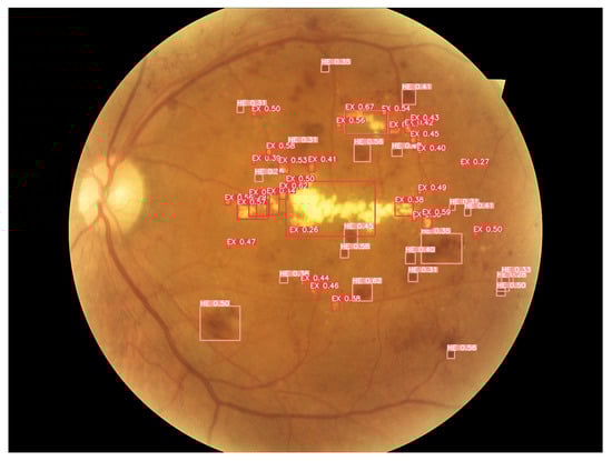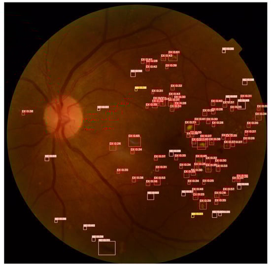 In the post-processing of the detection of fundus lesions, it was necessary to perform the screening and removal of duplicated bounding boxes representing the same object. The NMS technique was used for that, which keeps the bounding box detected with a higher precision index. Therefore, the NMS method used is based on the obtained values (IoU_nms), in which a threshold of [] was set for the training step.