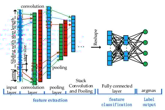 - The first step of feature extraction: The design of a dimensional convolutional neural network is to learn and extract the features with depth discrimination and sensitivity from the original vibration signal. In this experiment, two convolution pooling layers are designed. Convolution layer 1 uses the 150 × 1 wide convolution kernel to extract the feature of the signal to reduce the influence of noise [30]. Convolution layer 2 uses a large number of 8 × 1 narrow convolutions to mine the underlying features to extract the deep features of the signal. At the same time, to reduce the training parameters of the model and improve the training speed, a pooling layer is added after each convolution layer for feature reduction;