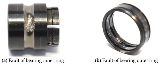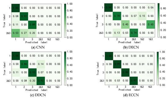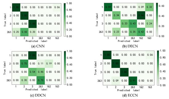 - In terms of the training loss function, the traditional CNN uses the binary classification cross entropy-loss function (Formula (7)) to train the model. When a certain type of fault exists, the loss value of other types of faults is zero, resulting in a strong mutual exclusion of the extracted features of the trained model. ECCN uses the margin loss function (Formula (14)) to train each fault class, which ensures that the fault features that are extracted from the various faults are relatively independent and avoids the problem of being unable to identify compound fault information.