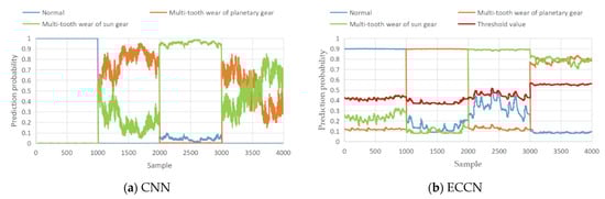 - In addition, in terms of label output, the traditional CNN uses the argmax function (Formula (6)) to index the maximum value of the output feature, so that the network can only output the fault feature with the strongest feature. Therefore, as shown in Figure 4 and Figure 13a, the CNN classifier can only output a single fault label with the largest probability in the compound fault sample, and a fault label with a weak fault will not be able to output. The proposed ECCN uses the squashing activation function (Formula (11)) to independently normalize the fault characteristics and uses the L2 norm to independently output the occurrence probability of each fault, ensuring the independence of each fault identification. Therefore, the ECCN can independently identify and output the fault characteristics of planetary wheel wear and solar wheel wear in compound faults and implement the multi-label output of compound faults, as shown in Figure 13b.