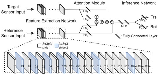 The final output of the FEN is 1024 feature volumes. The number of cells in the feature volume depends on the size of the voxel, but we let V be the number of cells in the feature volume. At this time, because each feature volume can be reconstructed as a V-dimensional column vector, we represent 1024 feature volumes as a matrix F of dimension V × 1024. The outputs of FENs for the reference and target sensors are denoted by Fr and Ft, respectively.