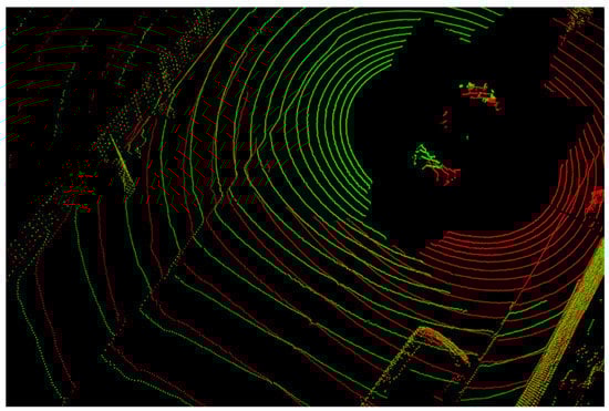 Point cloud constituting one frame in the Oxford dataset. The green dots represent points obtained by the right LiDAR, and the red dots represent the points obtained by the left LiDAR.