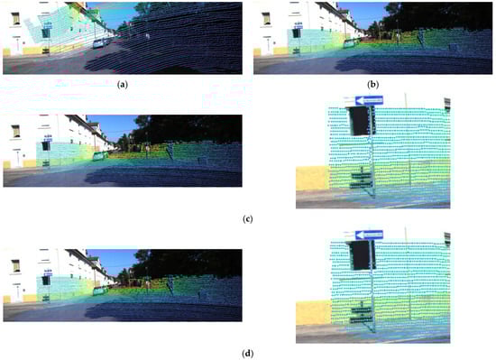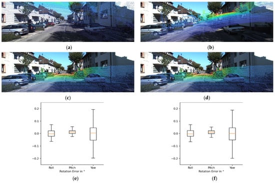 Figure 3 shows a visual representation of the results for performing calibration on the KITTI dataset using the proposed five networks. In this experiment, we transform a point cloud using the calibration matrix inferred from the proposed network and using the ground-truth parameters given in the dataset. We want to show how consistent these two transformation results are. Figure 3a,b show the transformation of a point cloud by randomly sampled deviations from Rg1 and the calibrated parameters given in the KITTI dataset, respectively. The left side of Figure 3c shows the transformation of the point cloud by predicted by the trained Net1. This result looks suitable, but as shown to the right of Figure 3c, it can be seen that the points measured on a thin column were projected to positions that deviated from the column. The effect of iterative refinement appears here. Calibration does not end at Net1 but continues to Net5. Figure 3d shows the transformation of the point cloud by obtained after performing calibration up to Net5. By comparing the result of Figure 3d with the result shown in Figure 3c, we can see that the calibration accuracy is improved: suitable alignment even with the thin column.