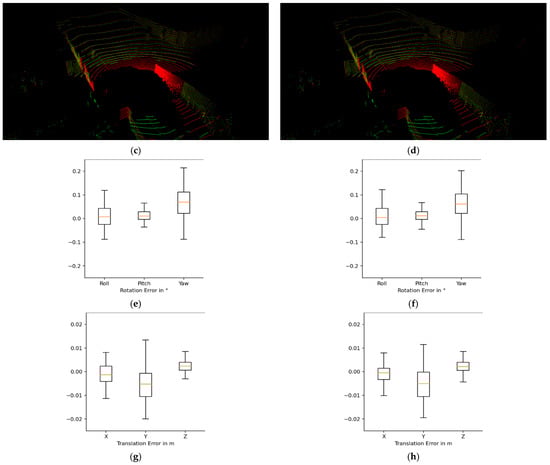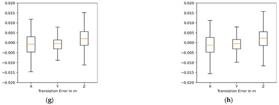 Figure 7 shows two examples of the error distribution of individual components by means of boxplots, as shown in Figure 4. From these experiments, we can see that temporal filtering provides suitable calibration results regardless of the amount of arbitrary deviation, even for LiDAR-LiDAR calibration. The green dots shown in Figure 7a,b are both obtained by transforming the same point cloud of the target sensor with randomly sampled deviations from Rg1, but the sampled deviations are different. As shown in Figure 7e–g, the distribution of calibration errors is similar despite the large difference in sampled deviations. In these experiments, the size of the frame bundle used in the temporal filtering was 100.